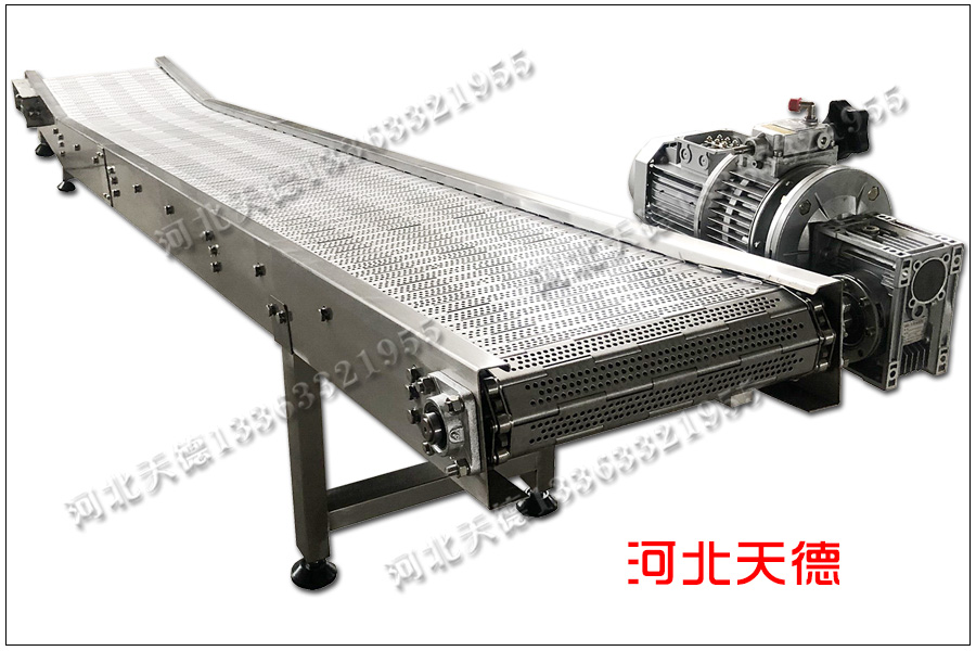 整機(jī)采用耐高溫不銹鋼304材質(zhì)加工,鏈板采用1.2毫米的鋼板通過激光裁剪轉(zhuǎn)彎加工的,為了透氣鏈板輸送帶的表面進(jìn)行了打孔處理,